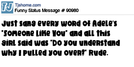 X Just sang every word of Adele's "Someone Like You" and all this girl said was "Do you understand why I pulled you over?" Rude.