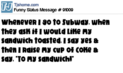 X Whenever I go to Subway, when they ask if I would like my sandwich toasted, I say yes & then I raise my cup of Coke & say, "To my sandwich!"
