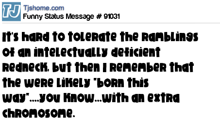 X is It's hard to tolerate the ramblings of an intelectually deficient redneck, but then I remember that the were likely "born this way"....you know...with an extra chromosome.