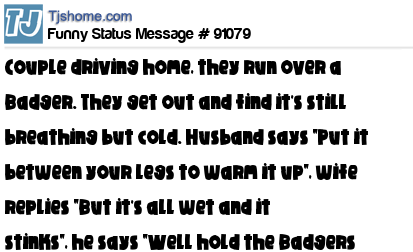 X is Couple driving home, they run over a Badger. They get out and find it's still breathing but cold. Husband says "Put it between your legs to warm it up", wife replies "But it's all wet and it stinks", he says "Well hold the Badgers nose then!"