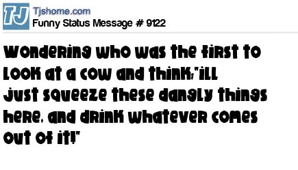 - # 4837 The more you think about things, the weirder they seem. Take this milk. Why do we drink *cow* milk?? Who was the guy who first looked at a cow and said, "I think I'll drink whatever comes out of these things when I squeeze 'em.