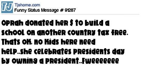 X is Oprah donated her $ to build a school on another country tax free. Thats ok, no kids here need help..she celebrates presidents day by owning a president..Fweeeeeee