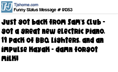 X Just got back from Sam's Club - got a great new electric piano, 19 pack of BBQ lighters, and an impulse kayak - damn forgot milk!