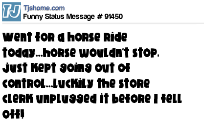 X is Went for a horse ride today...horse wouldn't stop, just kept going out of control...luckily the store clerk unplugged it before I fell off!