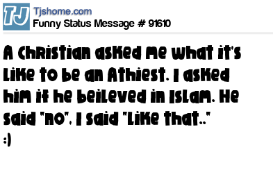 X A Christian asked me what it's like to be an Athiest. I asked him if he beileved in Islam. He said "no", I said "like that.." :)