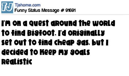 X says I'm on a quest around the world to find Bigfoot. I'd originally set out to find cheap gas, but I decided to keep my goals realistic