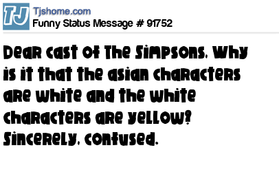 X Dear cast of The Simpsons, Why is it that the asian characters are white and the white characters are yellow? Sincerely, confused.