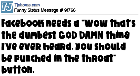 - # 130973 Facebook needs a 'Wow that's the dumbest f*cking thing I've ever heard, you should be punched in the throat' button.