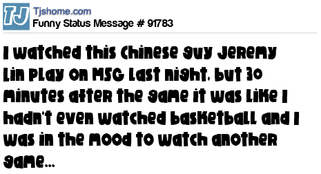 X is I watched this Chinese guy Jeremy Lin play on MSG last night, but 30 minutes after the game it was like I hadn't even watched basketball and I was in the mood to watch another game...