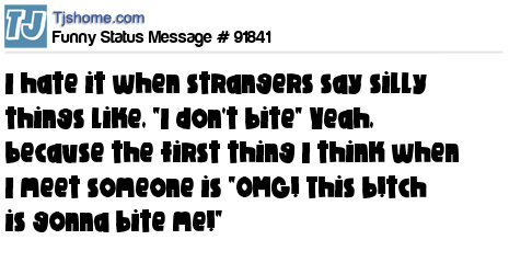 X says I hate it when strangers say silly things like, "I don't bite" Yeah, because the first thing I think when I meet someone is "OMG! This b!tch is gonna bite me!"