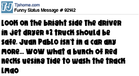 X is Look on the bright side The driver in jet dryer #2 truck should be safe, Juan Pablo isn't in a car any more... WoW what a bunch of red necks uesing Tide to wash the track lmao