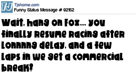 X is Wait, hang on Fox... you finally resume racing after lonnnng delay, and a few laps in we get a commercial break?