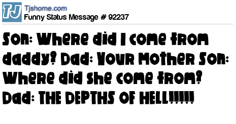 X says Son: Where did I come from daddy? Dad: Your Mother Son: Where did she come from? Dad: THE DEPTHS OF HELL!!!!!