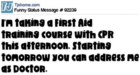 X I'm taking a First Aid training course with CPR this afternoon. Starting tomorrow you can address me as Doctor.