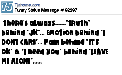 - # 23766 There's always a truth behind "JUST KIDDING", a little emotion behind "I DON'T CARE", a little pain behind "IT'S OKAY", a little "I NEED U" behind "LEAVE ME ALONE