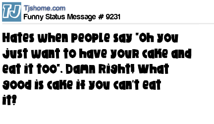 - # 56887 I hate When people say "Oh you just want to have your cake and eat it too". Damn Right! What good is cake if you can't eat it?