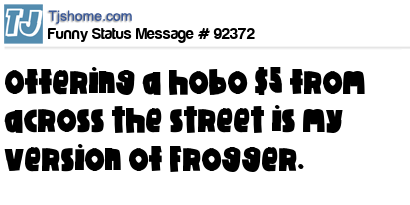 - # 177704 Offering a homeless dude $5 from across the street is my version of Frogger.