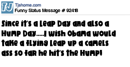 X is Since it's a Leap Day and also a Hump Day.....I wish Obama would take a flying Leap up a camels ass so far he hit's the Hump!