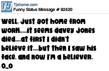 - # 92392 I really thought my missus was joking when she said Davy Jones had died. Then I saw her face......... now I'm a believer.......