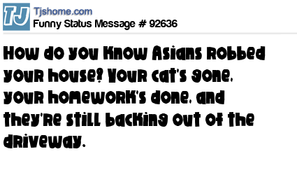 X is How do you know Asians robbed your house? Your cat's gone, your homework's done, and they're still backing out of the driveway.