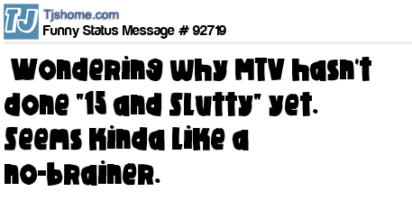- # 92728 Wondering why MTV hasn't done "15 and Slutty" yet... it would air just before "Teen mom".. Seems kinda like a no-brainer.