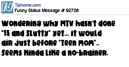 - # 92719 Wondering why MTV hasn't done "15 and Slutty" yet. Seems kinda like a no-brainer.