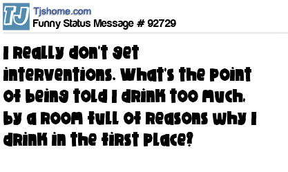 - # 74291 I don't understand interventions. What's the point of being told I drink too much by a room full of the reasons I drink in the first place?