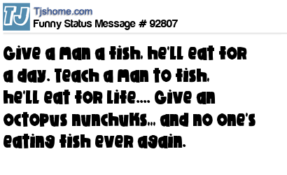 - # 100671 Give a man a fish, he'll eat for a day. Teach a man to fish, he'll eat for life. Give an octopus nunchuks, no one's eating fish ever again