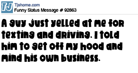- # 169414 A guy just yelled at me for texting and driving. I told him to get off my hood and mind his own business".