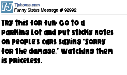 X is Try this for fun: Go to a parking lot and put sticky notes on people's cars saying "Sorry for the damage." Watching them is priceless.