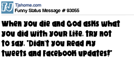 - # 43414 When God asks what you've done with your life, try not to say "Didn't you read my facebook status updates?"