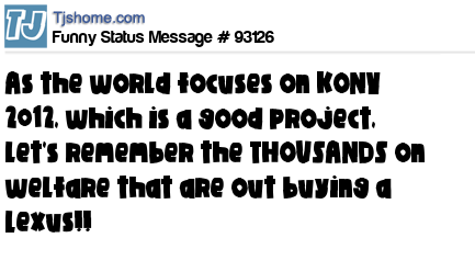 X As the world focuses on KONY 2012, which is a good project, let's remember the THOUSANDS on welfare that are out buying a Lexus!!