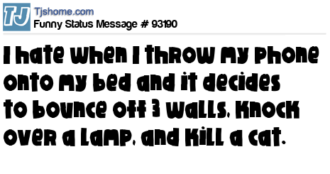 - # 194855 That moment when you gently throw your phone onto your bed and it decides to bounce off 3 walls, hit a lamp and kill a cat.