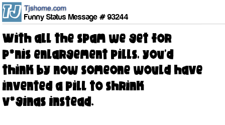 X With all the spam we get for p*nis enlargement pills, you'd think by now someone would have invented a pill to shrink v*ginas instead.