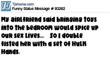 X says My girlfriend said bringing toys into the bedroom would spice up our sex lives... So I double fisted her with a set of Hulk Hands.