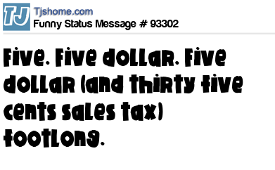 - # 100279 I'd like a $5 dollar footlong"....."That'll be 7.05"....."Bi$ch what??