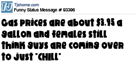 - # 94509 Gas prices are about $4.95 a gallon and females still think a guy is coming over to just "Chill"
