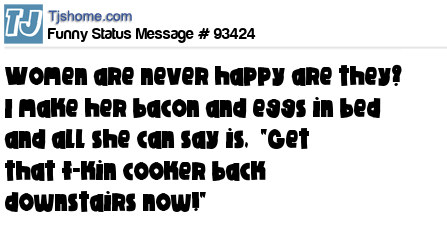 X is Women are never happy are they? I make her bacon and eggs in bed and all she can say is, "Get that f-kin cooker back downstairs now!"