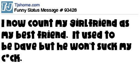 X  I now count my girlfriend as my best friend.  It used to be Dave but he won't suck my c*ck.