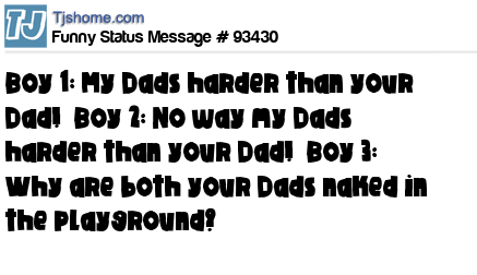 X Boy 1: My Dads harder than your Dad! Boy 2: No way my Dads harder than your Dad! Boy 3: Why are both your Dads naked in the playground?