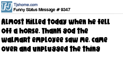 - # 12161 was almost killed today when he fell off a horse. Thank goodness the Wal-Mart employee saw me, came over and unplugged the thing!