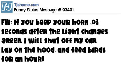 - # 96554 When I drive if you beep your horn .31 seconds after the light changes green I will shut off my car, lay on the hood & feed birds for an hour.
