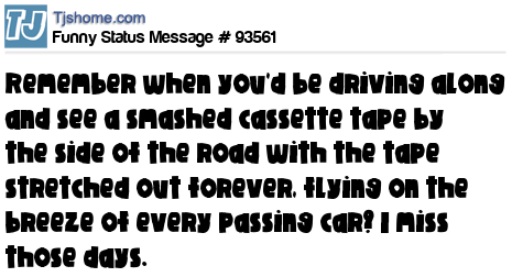 X Remember when you'd be driving along and see a smashed cassette tape by the side of the road with the tape stretched out forever, flying on the breeze of every passing car? I miss those days.
