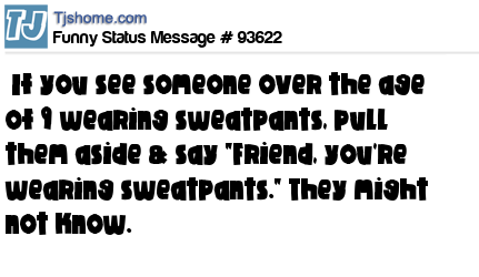 X says If you see someone over the age of 9 wearing sweatpants, pull them aside & say "Friend, you're wearing sweatpants." They might not know.