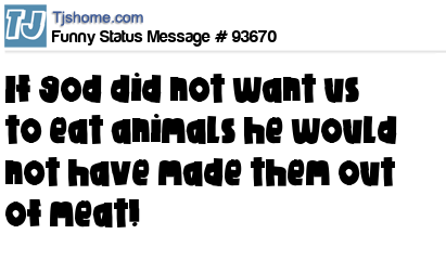 - # 7038 if God didn't want us to eat animals, he wouldn't have made them out of meat!!!