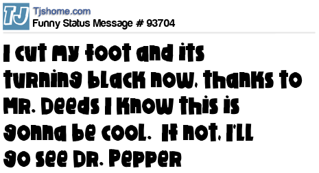 X is I cut my foot and its turning black now, thanks to Mr. Deeds I know this is gonna be cool.  If not, I'll go see Dr. Pepper