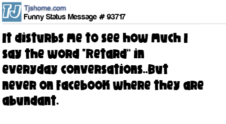 X It disturbs me to see how much I say the word "Retard'' in everyday conversations..But never on Facebook where they are abundant.