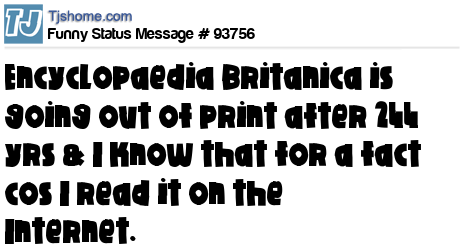 X Encyclopaedia Britanica is going out of print after 244 yrs & I know that for a fact cos I read it on the Internet.