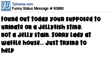 - # 166759 Found out today your supposed to urinate on a jellyfish sting, not a jelly stain. Sorry lady at waffle house....just trying to help.