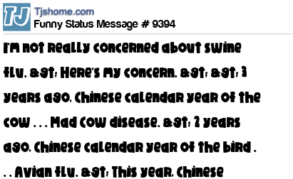 X says I'm not really concerned about swine flu. > Here's my concern. > > 3 years ago, Chinese calendar year of the cow . . . Mad Cow disease. > 2 years ago, Chinese calendar year of the bird . . . Avian flu. > This year, Chinese calendar year of